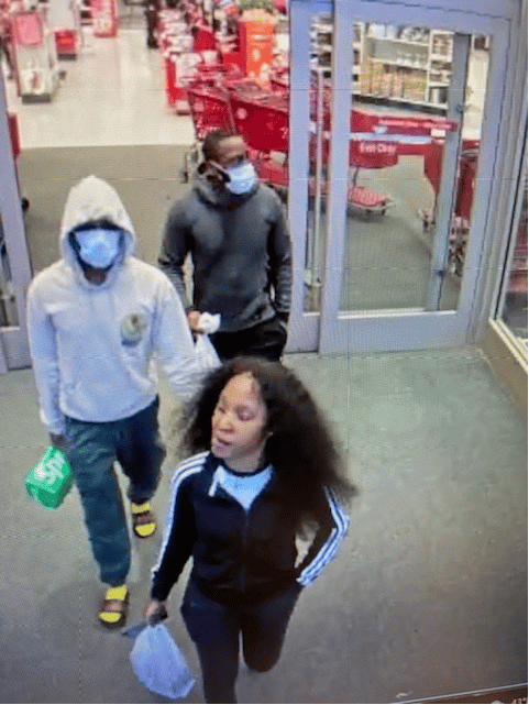 The two males and one female captured on surveillance footage are suspects in the incident, which resulted in the use of stolen credit cards for more than $2,000 in purchases. They were seen traveling in a dark gray Nissan Sentra.